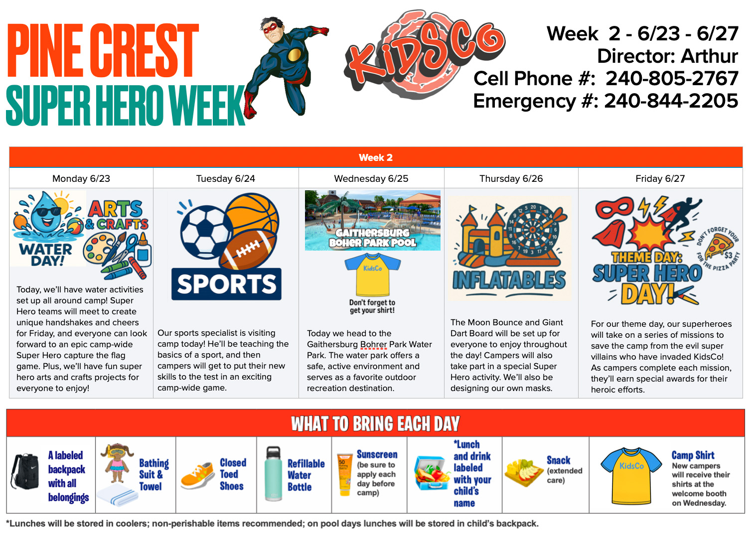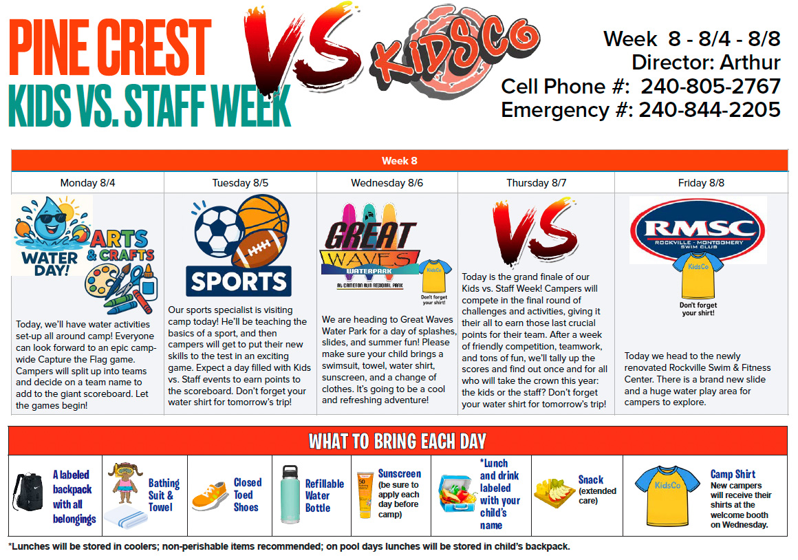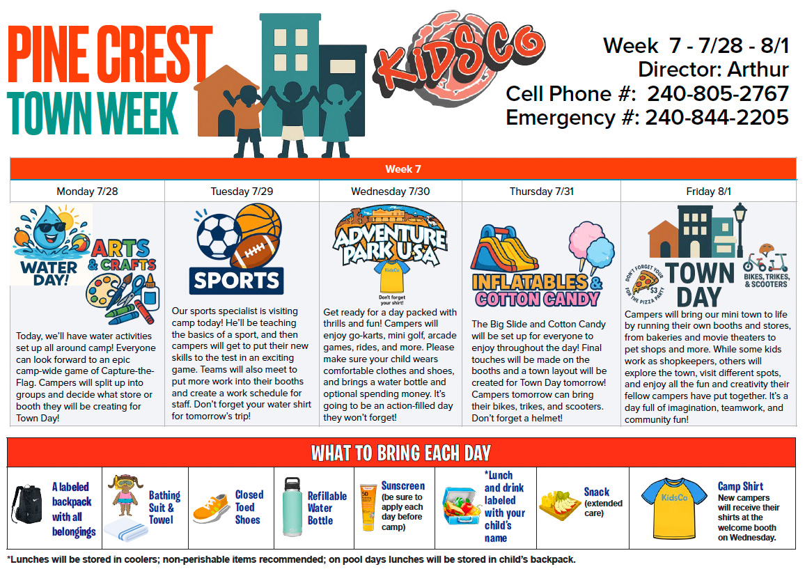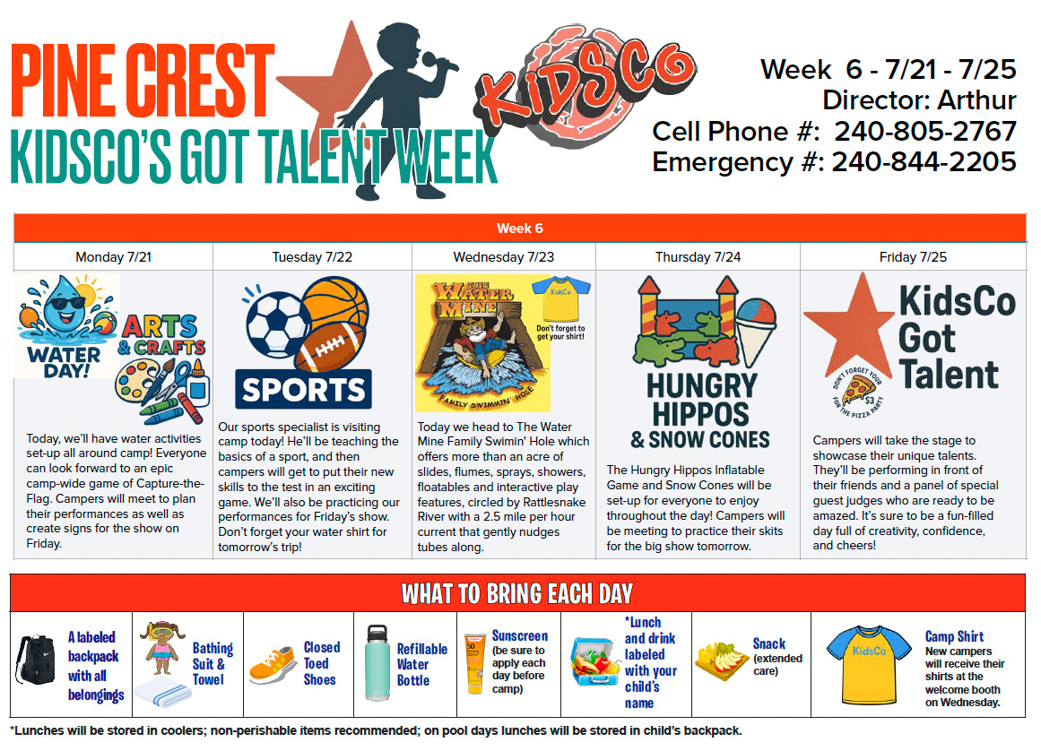 Welcome to the 2025 Pine Crest Summer Day Camp Portal! Here you will find all the schedules and info you need to know about camp 2025. Each week’s schedule will be posted ahead of time so you can plan what to pack each day. We hope you have a great summer here at KidsCo!